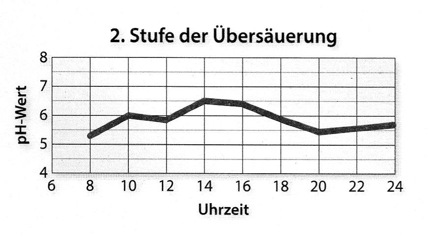 Die Basenflut nach der Mahlzeit tritt nicht mehr so deutlich auf und die pH-Werte liegen im leicht sauren Bereich. In diesem Fall liegt eine intrazelluläre Säurebelastung vor und die Puffersysteme des Körpers sind erschöpft. Der Stoffaustausch der Zelle ist blockiert und es kommt keine gute Dynamik mehr zustande.